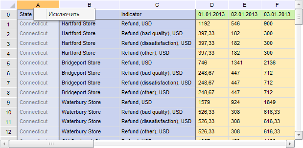 Корректировка диапазона осуществляется путем удаления строки и столбцов с ненужными данными. Для удаления столбца/строки выполните команду контекстного меню «Исключить» в области заголовка таблицы: