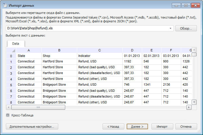 Если флажок «Кросс-таблица» установлен, то будут отображены дополнительные страницы мастера, позволяющие произвести настройку и идентификацию данных в кросс-таблице. Кросс-таблица - это сводная таблица, в которой заголовки могут располагаться как по строкам, так и по столбцам, позволяя таким образом отразить взаимосвязь двух и более переменных между друг другом.