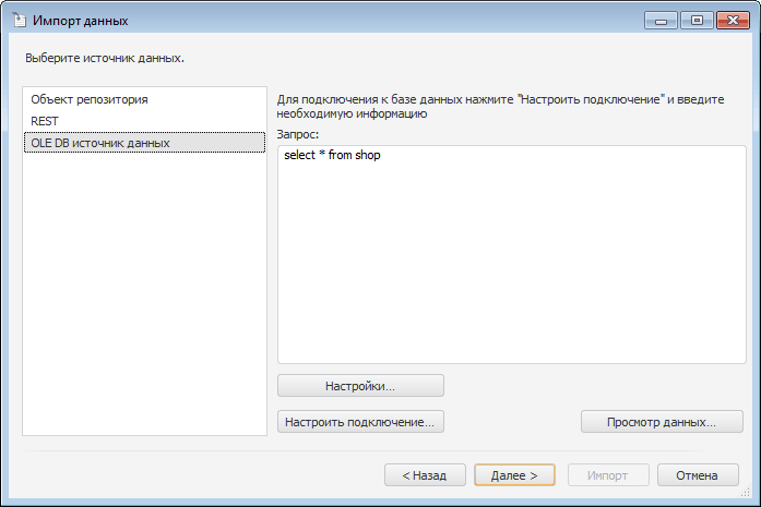 Microsoft Access. В дополнительном поле «SQL-запрос» задайте запрос к таблицам базы данных и нажмите кнопку «Выполнить». На основании запроса будут получены и отображены импортируемые данные;