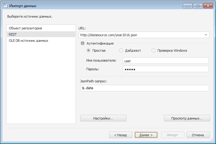 JSON. В дополнительном поле «JsonPath- запрос» укажите запрос и нажмите кнопку «Выполнить». На основании запроса будут получены и отображены первые сто записей импортируемых данных.