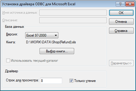 В зависимости от выбранного драйвера открываемые диалоги будут иметь различный вид. Пример диалога для настройки драйвера Microsoft Excel: