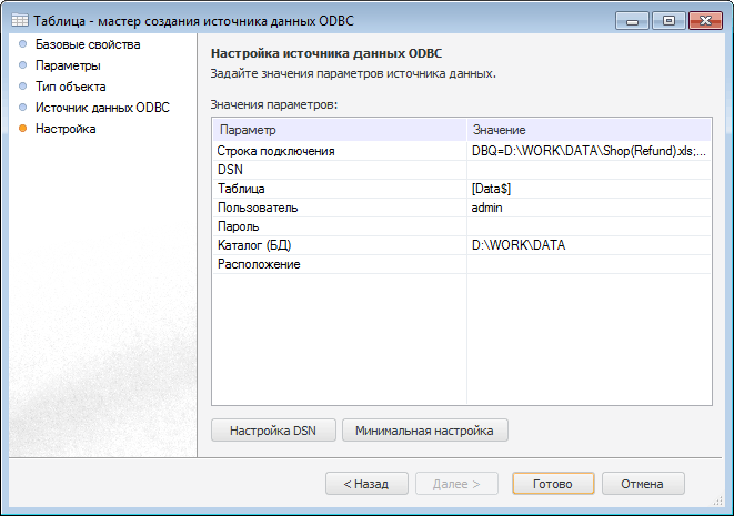 Если создается новый источник данных, то нажмите кнопку «Минимальная настройка» для настройки драйвера. Для получения более подробной информации по установке драйверов для внешних источников необходимо обратиться к стандартной справке ODBC, которая вызывается при нажатии на кнопку «Справка» в каждом окне установки драйверов для выбранных источников.