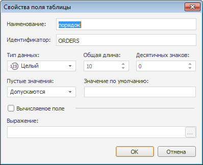 На странице «Поля таблицы» добавьте поля. Для это нажмите кнопку «Добавить». На экране появится редактор свойств поля: