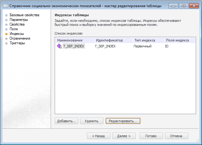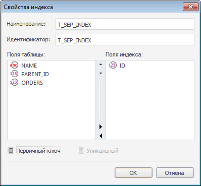 Для создания индекса на странице «Индексы таблицы» нажмите на кнопку «Добавить». Будет открыт диалог «Свойства индекса»: