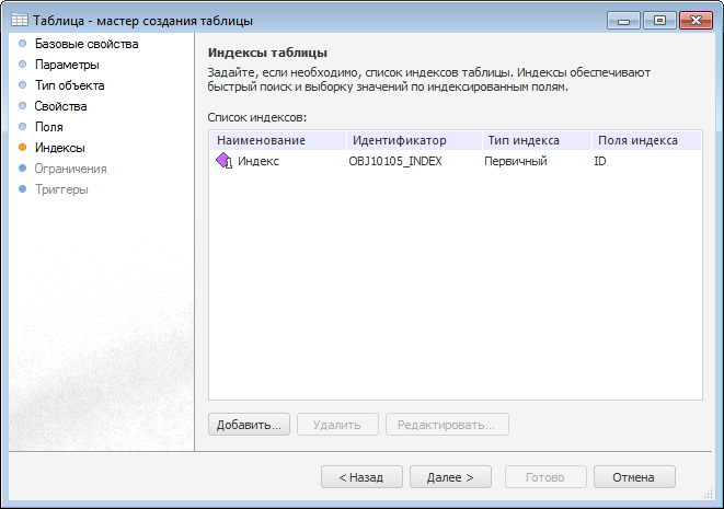 На странице «Индексы таблицы» задается список индексов таблицы. Индексирование обеспечивает быстрый поиск и выборку значений, а также соблюдение уникальности значений определенных полей. Часто поиск осуществляется по различным полям или группам полей. В таких случаях есть смысл создавать несколько индексов.