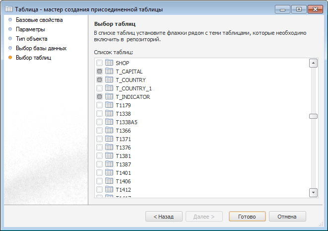 На странице «Выбор таблиц» выберите таблицы, которые будут включены в репозиторий. Для этого в списке таблиц установите флажки рядом с теми таблицами, которые необходимо включить в репозиторий в качестве присоединенных.