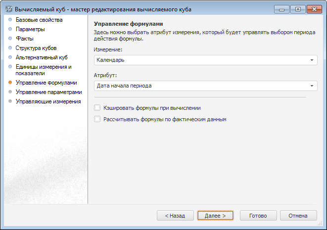 На странице «Управление формулами» укажите атрибут измерения, который будет управлять выбором периода действия формул.