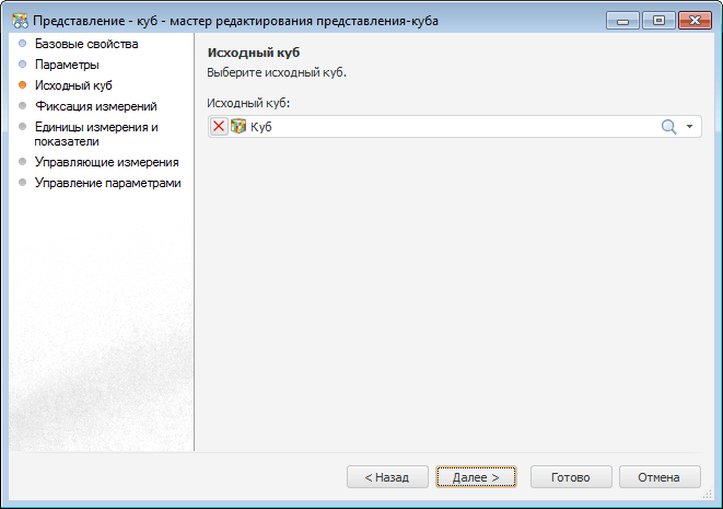 На странице «Исходный куб» выбирается куб, на основе которого будет построен куб-представление.