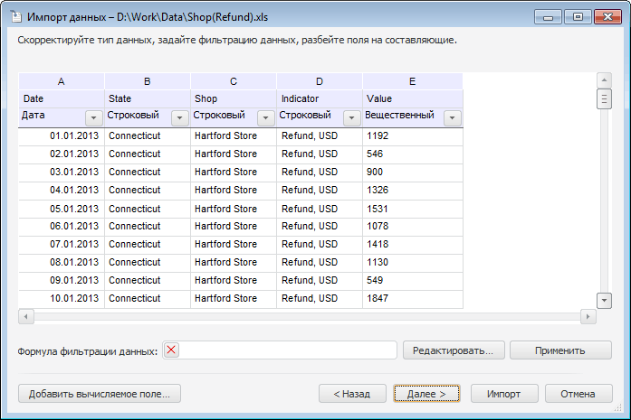 Поля автоматически будут разбиты по измерениям, значения текстовых полей будут импортированы как значения атрибута «Наименование» элементов измерения. Все поля, имеющие вещественный тип данных, импортируются как значения. Для каждого поля со значением будет создан факт в измерении фактов.