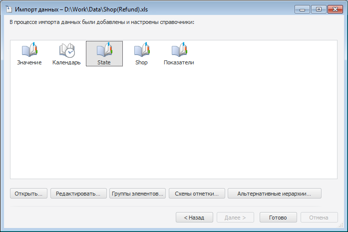 На последней странице мастера можно доработать справочники, используемые в структуре созданного куба. Можно создать группы элементов, схемы отметки или альтернативные иерархии. При нажатии кнопки «Готово» окно мастера импорта будет закрыто.