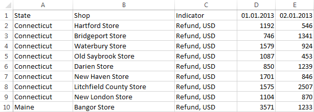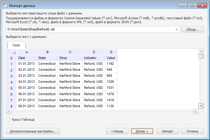 Рассмотрим пример импорта данных, представленных в виде кросс-таблицы. Кросс-таблица - это способ представления данных, при котором информация о различных показателях располагается в заголовках строк и столбцов, а на пересечении строк и столбцов располагаются фактические данные. В примере импорта использован файл Microsoft Excel, данные в котором расположены в следующем виде: