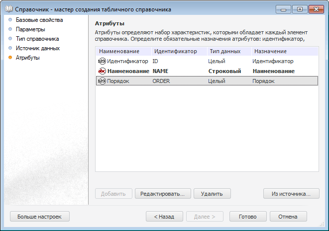задается список атрибутов справочника и их назначение. Список атрибутов