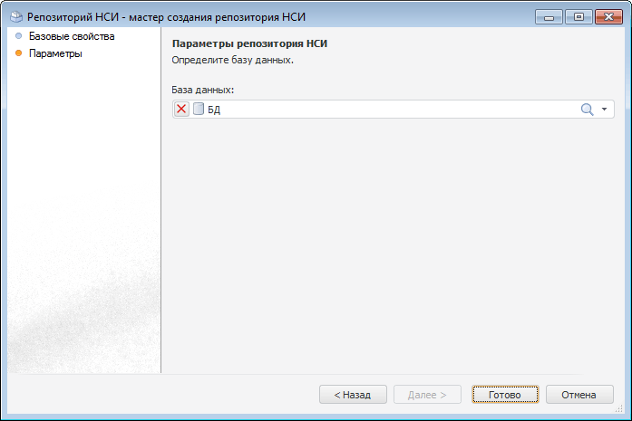 На странице «Параметры» необходимо выбрать базу данных, в которой будут храниться создаваемые объекты.