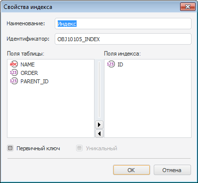 Поля индекса. Список полей, входящих в индекс и их порядок. Если индекс состоит из нескольких полей, то поиск первоначально будет происходить по самому первому (верхнему в списке) полю, потом по второму и т.д. Добавление полей из списка «Поля таблицы» в список «Поля индекса» осуществляется с помощью механизма перетаскивания или двойным щелчком левой кнопки мыши по индексу;