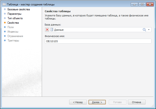 На странице «Свойства таблицы» определяется база данных, в которой будет создана таблица, а также физическое имя. Физическое имя таблицы - имя, с которым она будет создана в выбранной базе данных. В качестве физического имени таблицы по умолчанию предлагается использовать идентификатор таблицы.