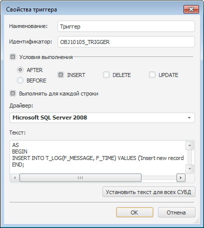 Примечание. Если выбран какой-либо драйвер Microsoft SQL Server, то переключатель After/Before не влияет на создаваемый триггер, так как в Microsoft SQL Server такое деление отсутствует.