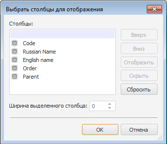 Сбросить. Сбрасывает настройки в исходные: все колонки будут отмечены и выстроены в том порядке, в котором они хранятся в базе (или запрашиваются в запросе).