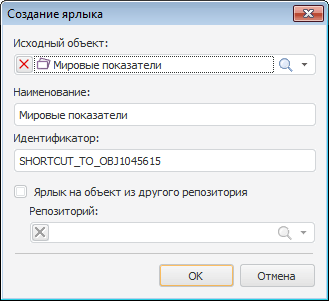 Ярлык на объект из другого репозитория. При установке данного флажка в поле «Репозиторий» выберите объект «Связь с репозиторием», который позволит получить доступ из текущего репозитория к объекту другого репозитория. После выберите объект в поле «Исходный объект».