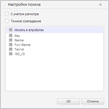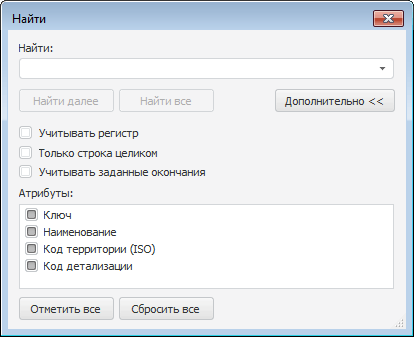 Атрибуты. Можно установить флажки для тех атрибутов, по которым требуется осуществить поиск. По умолчанию флажки установлены для всех видимых атрибутов. Скрытые атрибуты в списке не отображаются. Также установить/снять отметку для всех атрибутов элементов можно с помощью кнопок «Отметить все», «Сбросить все».