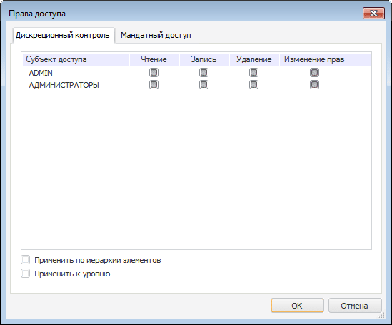 дискреционный контроль. Основан на использовании списков контроля доступа, назначаемых каждому объекту системы. Доступен, если на вкладке «Описание» установлен флажок «Элементы имеют дискреционные права доступа»;