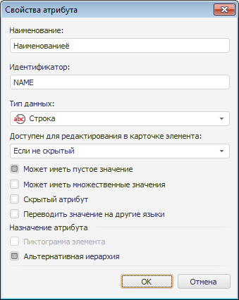 При создании/редактировании обычного атрибута будет открыто окно «Свойства атрибута»: