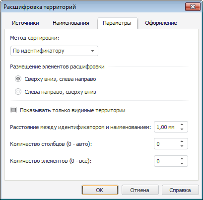 Для настройки элементов расшифровки территорий используйте вкладку «Параметры» в диалоге «Расшифровка территорий».