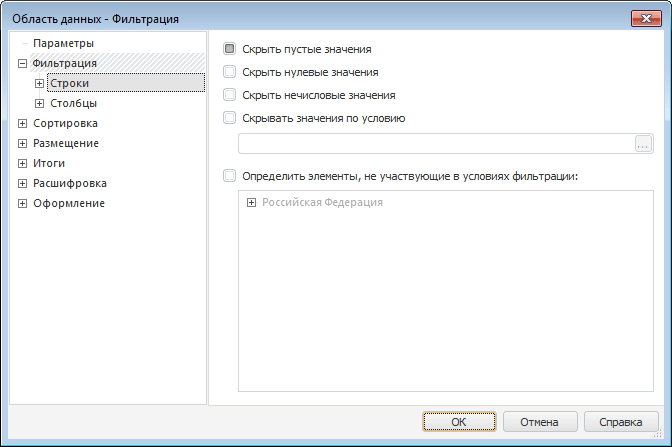 Следующим шагом по настройке параметров области данных является фильтрация данных. Задайте условия фильтрации строк и столбцов на вкладке «Фильтрация»: