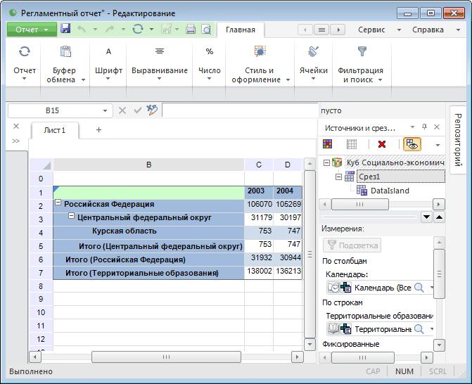 в раскрывающемся списке срезов выберите «Куб Cоциально-экономические показатели:Срез 1»;