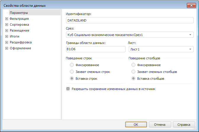 При установленном флажке «Разрешить сохранение измененных данных в источник» измененные данные области будут сохраняться в источник данных. Если флажок снят, то измененные данные не будут сохраняться в источник.