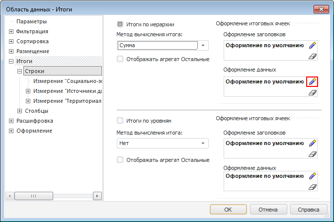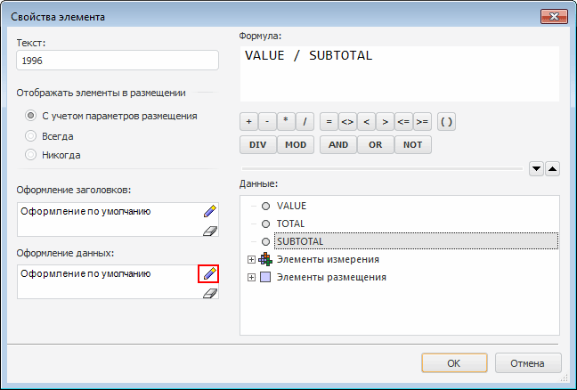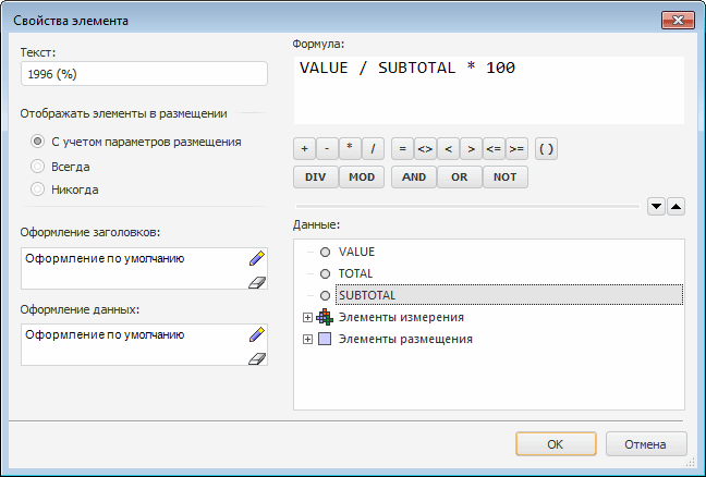 Для любой области данных можно настроить вывод итоговых значений. Иногда требуется отображение не самого значения ячейки, а его доли в процентах к промежуточному итогу по соответствующему уровню, либо общему итогу. Такой расчет может быть настроен только для отдельных столбцов/строк и при размещении нескольких измерений по строкам/столбцам. Для наглядности можно произвести настройку так, что некоторые столбцы/строки будут отображать абсолютные значения, а некоторые долю в процентах.