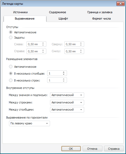 Для настройки выравнивания содержимого легенды перейдите на вкладку «Выравнивание» окна «Легенда карты»: