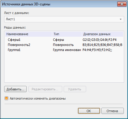Каждый объект 3D-сцены (поверхность, сферы) представляется рядом данных, для которого необходимо определить источник данных. В источнике по строкам размещаются точки ряда (или вершины многомерной фигуры), а по столбцам значения координат (X, Y, Z) и радиус точек.
