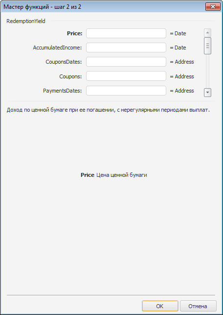 Мастер функций для функции «RedemptionYield» выглядит следующим образом: