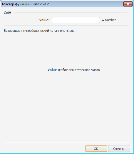 Value. Угол в радианах, гиперболический котангенс которого требуется вычислить. Гиперболический котангенс имеет точку разрыва 0о.