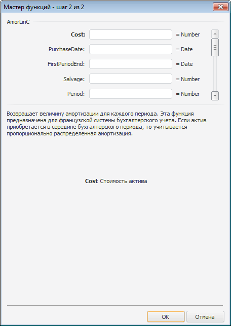 | =AmorLinC(2000, "01.01.2008", "01.08.2008", 200, 1, 0.15, 3) | 300 | Величина амортизации на следующих условиях: