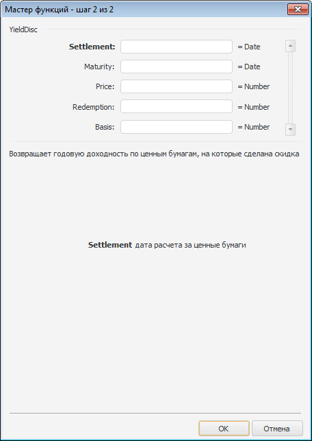 Мастер функций для функции «YieldDisc» выглядит следующим образом: