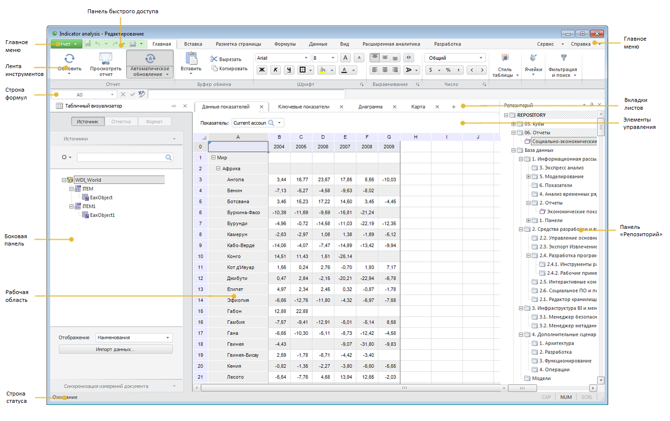Рабочая область. Область представляет собой активный лист отчета, предназначенный для размещения данных и объектов (табличного визуализатора, области формул, диаграммы, карты и прочих) и манипуляции с ними.