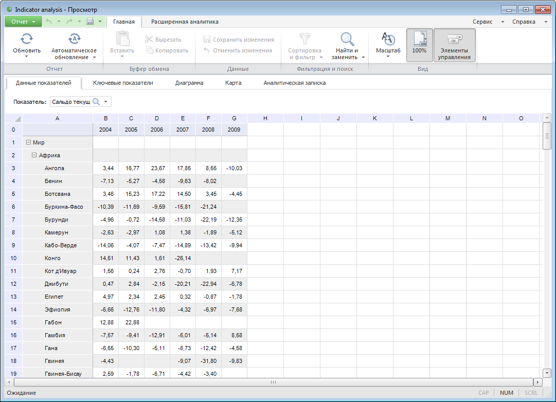 Лента инструментов. Содержит команды, упорядоченные в логические группы и собранные на вкладках. Команды предназначены для настройки параметров и управления объектами, расположенными на листах регламентного отчета.