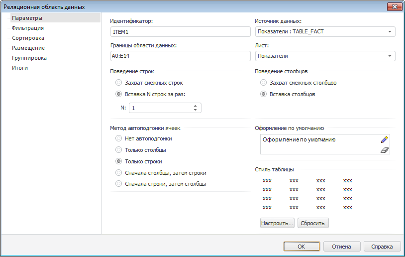 Параметры. Определите общие параметры для определения размещения, поведения и оформления реляционной области данных;
