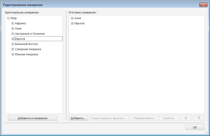 В области «Оригинальное измерение» отображаются элементы измерения до редактирования. В области «Итоговое измерение» - список элементов после редактирования.