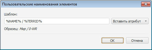 Задайте шаблон отображения наименований, выбирая необходимые атрибуты в раскрывающемся списке кнопки «Вставить атрибут».