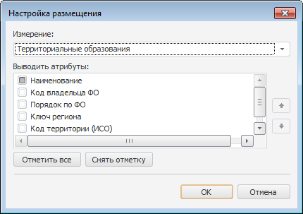Для таблицы и диаграммы можно настроить отображение наименований элементов измерений в рабочей области. Для настройки выберите один или несколько атрибутов справочника или задайте пользовательское наименование.