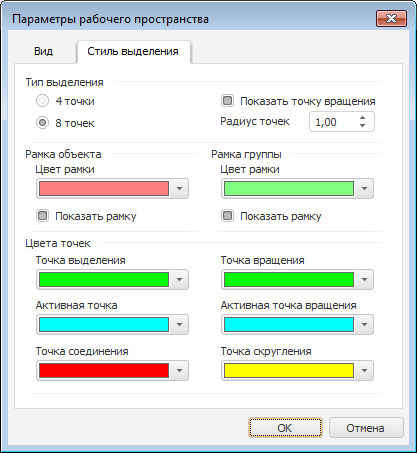 Тип выделения. Задает количество отображаемых точек при выделении объекта: 4 или 8. При снятии флажка «Показывать точку вращения» у выделенного объекта на рабочей области не отображается точка вращения;