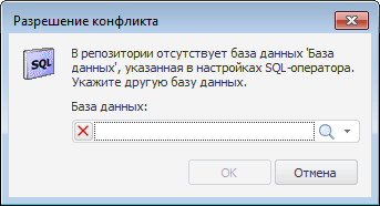 База данных <наименование> не найдена. Конфликт возникает, если в репозитории отсутствует БД, указанная в соединении SQL-оператора. Для разрешения конфликта следует нажать на гиперссылку в поле «Конфликт» и выбрать базу данных: