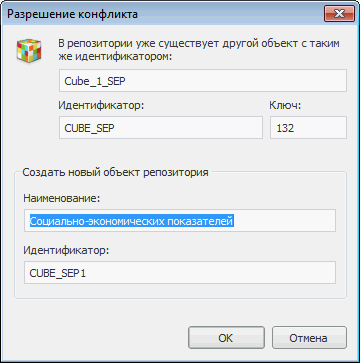 Для разрешения конфликта предлагается создать новый объект репозитория, изменив наименование и идентификатор. По умолчанию поля заполнены:
