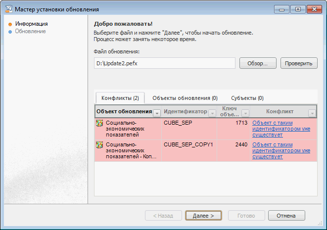 Объект с таким идентификатором/ключом уже существует. Совпадение ключа или идентификатора зависит от выбранного типа обновления. Для разрешения конфликта следует нажать на гиперссылку в поле «Конфликт»: