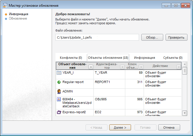 На вкладке «Объекты обновления» страницы «Информация» отображается список элементов обновления: