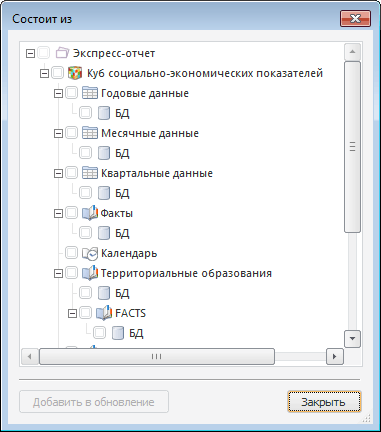 Окно содержит иерархический список объектов, которые используются при создании объекта. Для включения таких объектов в обновление отметьте их флажками и нажмите кнопку «Добавить в обновление».
