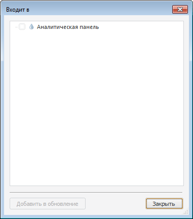 Окно содержит иерархический список объектов, содержащих данный объект. Для включения таких объектов в обновление отметьте их флажками и нажмите кнопку «Добавить в обновление».
