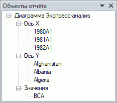 Работа с диаграммой выполняется с помощью панели «Объекты отчета». На данной панели название элемента, соответствующего диаграмме, формируется по следующему правилу: Диаграмма<Наименование источника данных>. Например: